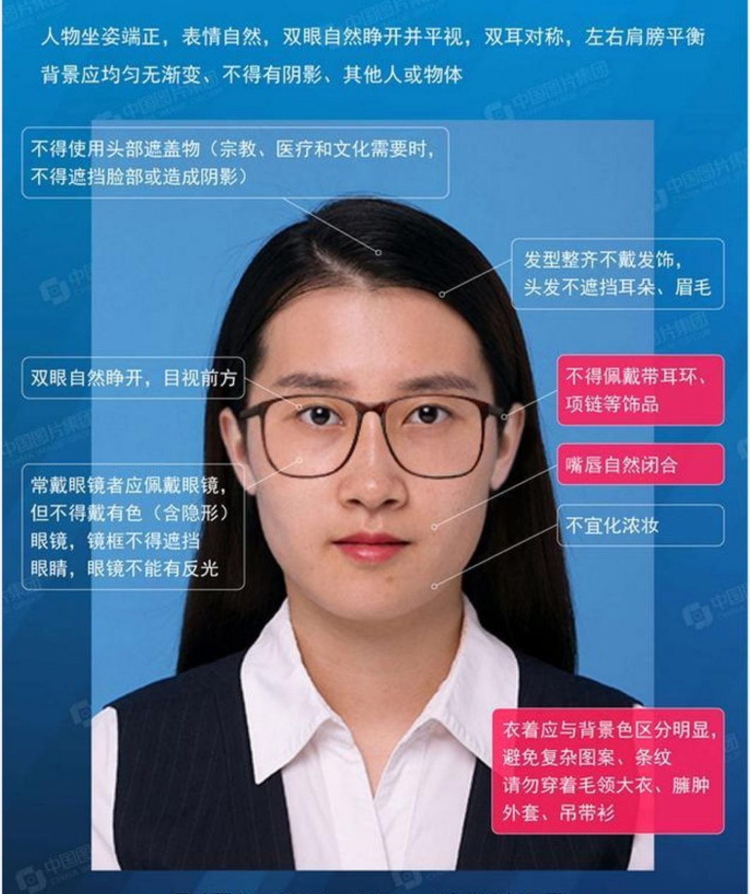 3、拍摄照片时正面面对摄像头(镜头),头发以不遮挡眉毛和耳朵为标准,碎发应提前梳理好。